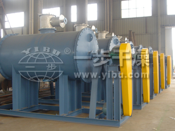 卧式搅拌真空干燥机是利用物料中的水份在真空状态下沸点降低的特点来进行干燥的设备。该设备用蒸汽(热水、导热油)对夹套间接加热,水份受热蒸发并被及时抽除。在干燥机壳体内部,耙齿通过传动轴带动,耙齿端与轴线设计有一定夹角,主轴通过正向反向转动,使物料沿轴向移动以利于干燥及出料。壳体内部可加入二根或四根敲击棒,以利于物料的快速干燥粉碎。敲击棒为与壳体等长的空心厚壁不锈钢管,其在壳体内部是自由运动的,敲击棒在内部不断敲击物料,使物料不断被敲碎(物料获得更大的比表面积)来加速干燥过程,成品物料质量更佳。